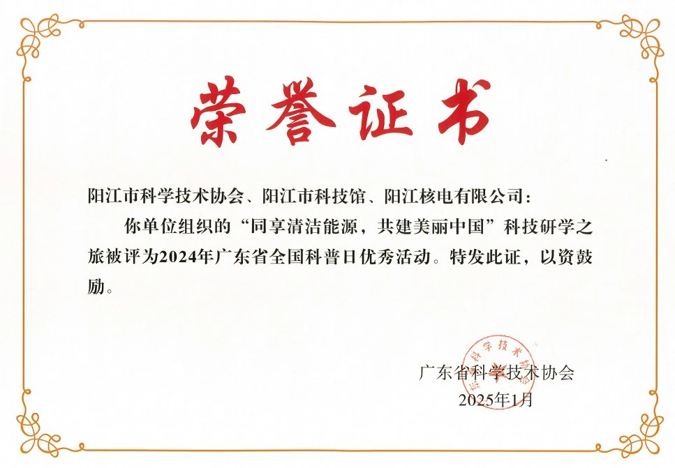 由阳江核电联合阳江市科学技术协会及阳江市科技馆组织的“同享清洁能源,共建美丽中国”科技研学之旅被评为2024年广东省全国科普日优秀活动阳江核电入选优秀组织单位。
