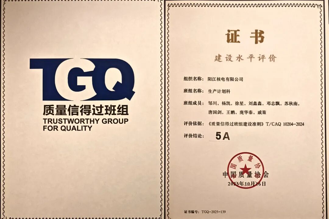 计划部生产计划科始终秉持“重技术、控风险、善谋划、懂经营”的价值理念,坚守“安全第一、质量第一、追求卓越”原则,深耕生产业务数字化转型、工作过程全流程管理、生产指挥中心运作管理等核心领域,将质量意识深度融入核电生产计划的每一个环节。通过精细化流程管控与持续性改进创新,为阳江核电安全生产稳定运行、运营效益提升提供了坚实可靠的计划保障。此次获评全国“质量信得过班组”5A级荣誉,成为阳江核电深耕质量文化建设、强化基层班组管理的又一重要里程碑。