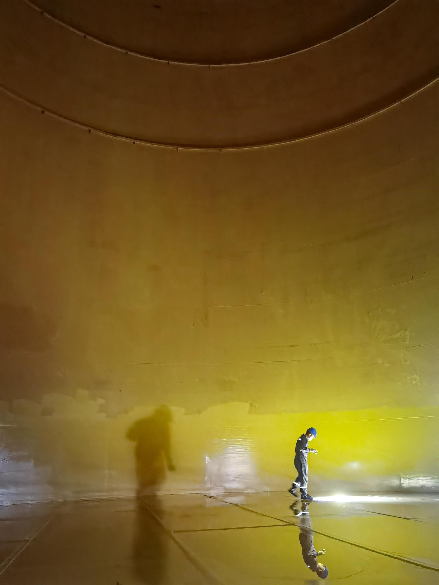 随着检查工作的进行,刚转身换个方位检查的吴文华,无意地将手电筒照向韩建峰。只见认真检查的韩建峰被照印出两个身影——积水倒影与身后光影都随着他向前低头巡检,三者在偌大的罐体里交相辉映。