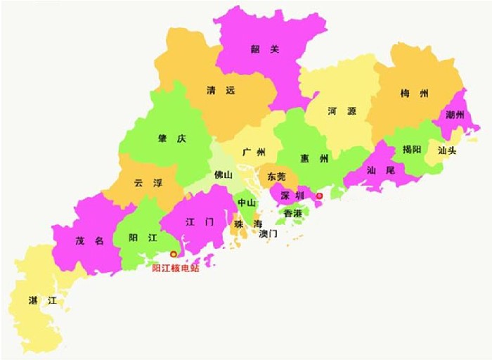 阳江核电站位于广东省阳江市阳东区东平镇沙环村。 厂址距阳江市35公里,距湛江市205公里,距珠海150公里,距广州189公里。 地理位置示意图: